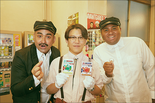 [写真左から]植野行雄(デニス/1982年、大阪府出身)、おたけ(ジャングルポケット/1982年、東京都出身)、アントニー(マテンロウ/1990年、東京都出身)が訪れている大人のおもちゃの博物館。毎月、館内に展示されているさまざまなアダルトグッズを前連載から継続して3人が紹介していく。