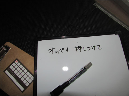 それは、ブースに用意されているホワイトボードを使うというもの。そこにこちらの要望を書き込んでミラーに密着させると、向こう側からもその内容が見えるのだ。
