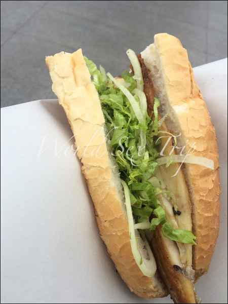 そして、バックパッカーに有名なのは「サバサンド」。書いたまま、さばの塩焼きをサンドイッチにしたもの。
