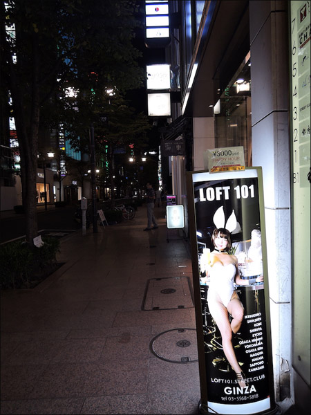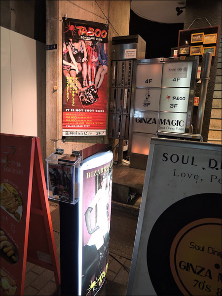 これは銀座のクラブ街も見逃してはならないと歩いてみると、ほんの数分でお色気系の飲み屋を立て続けに発見することになった。一軒はバニーのビアバーで、もう一軒はSMバーである。