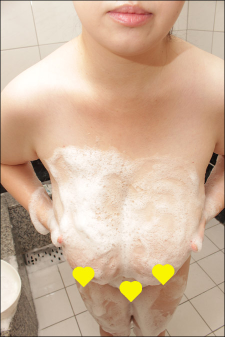 両乳房に腕を挟まれてのボディ洗いで、ダイレクトに重圧感を堪能。