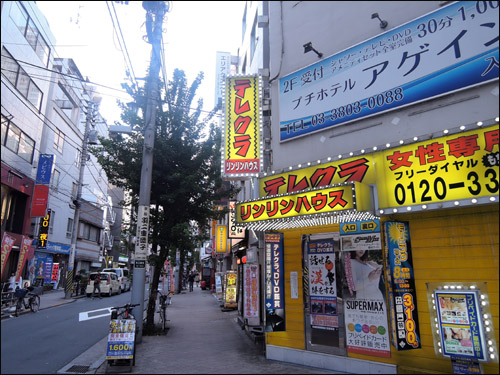 鶯谷方面から歩いてくると、駅が近づくにつれキラキラ煌めく看板が増えるが、ふと見るとそこにはテレクラがあり、複数のレンタルルームが隣接している。
