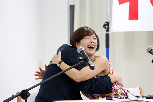 そんな張り詰めた空気のなか、最終問題の回答で会場中から拍手喝采を浴びる紗倉まなちゃん。この拍手が決定打となり紗倉まな&安田理央チームが優勝し第2回優勝チームに輝いた! この勝利に思わず抱き合い喜びを分かち合う2人。