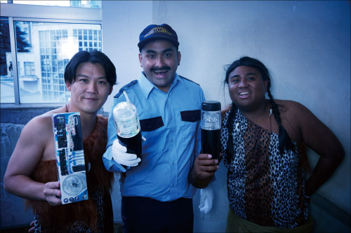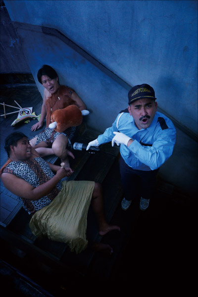 アダルトグッズ博物館の入り口を抜ければ、そこは不思議な幻想世界。閉館後に巡回中の植野警備員が不審な物音を聞きつけて、おたけ原人とアントニー原人の模型が展示されたコーナーにやって来ました。恐る恐る懐中電灯で照らしてみると、なんと原人たちが動いていた! でも、警備員の懐中電灯のほうがビックリ仰天のアイテムだったんです。