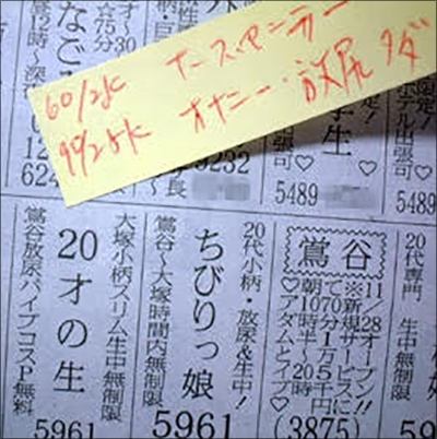 劣情を抱かせる大胆な見出しと電話番号だけが載った小さな広告で集客し、客が待つホテルに女の子を派遣して、フ⚫︎ラや素股だけでなく、セックスまでさせる。もちろん違法店だ。歓楽街に立つポン引きの役目を、新聞の三行広告にさせているのだ。