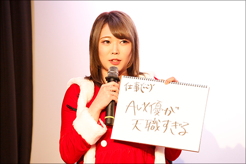 同じ事務所の後輩である黒崎さくちゃんが、「男優さんを本当に気持ちよくできているのか」と悩んでいると、「男優さんがオチンチンから精子を出しているのは気持ちいいからだよ」と回答。この回答に黒崎さくちゃんは、「とっても癒されました」と笑顔でコメントした。