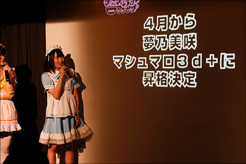 また、これまでメンバーを率いてきた夢乃美咲ちゃんが研究生を卒業し、4月からマシュマロ3d+の正式メンバーに加入することも発表。これにはメンバー、ファンから祝福の拍手と声援が送られた。