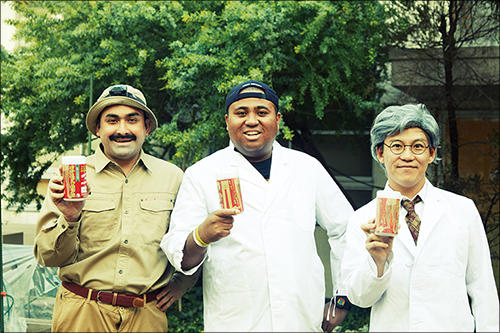 [写真左から]植野行雄(デニス/1982年、大阪府出身)、アントニー(マテンロウ/1990年、東京都出身)、おたけ(ジャングルポケット/1982年、東京都出身)が訪れている大人のおもちゃの博物館。毎月、館内に展示されているさまざまなアダルトグッズを前連載から継続して3人が紹介していく。