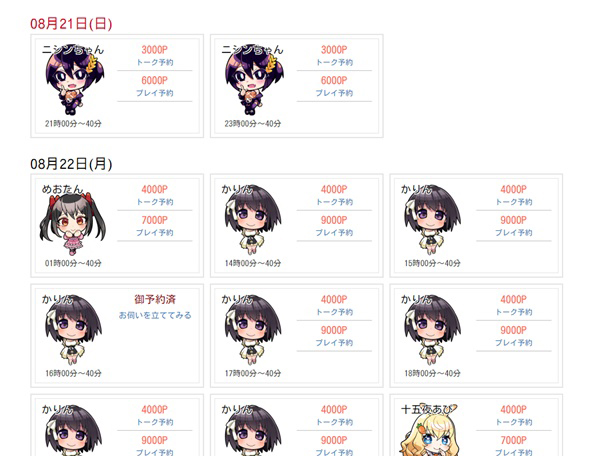 続いては、早速プレイの予約である。プレイのセッティングについてはコースから選択したり、所属しているキャストを観て選んだり、出勤表から自分の日程が合わせられそうなキャストから選んだりと様々。
