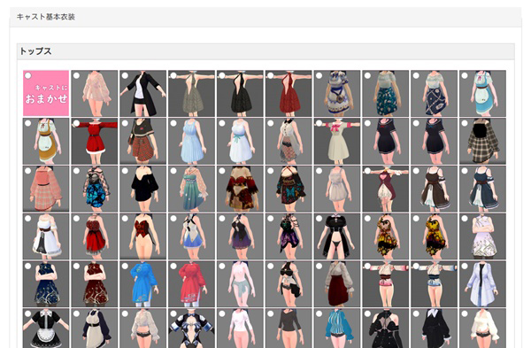 さらに、キャストの衣装についても設定が可能だ。ファッショナブルな服装から、その他にもチャイナ服やメイド服、体操着などの定番の衣装が並ぶ。さらに、ボトムスや下着、靴下、帽子や首飾りなどアクセサリー関連に至るまで、詳細なところまで選択できる。もちろん、面倒であれば全てキャストにお任せでも構わない。自分がこだわりたいところだけ設定して、あとはキャストにお任せするのがいいだろう。