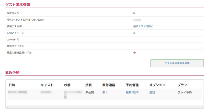 設定が完了すると、「X-Oasis」のマイページに直近の予約として登録される。日時や、キャスト名などが確認できるほか、前述のプレイ内容の設定変更も可能だ。