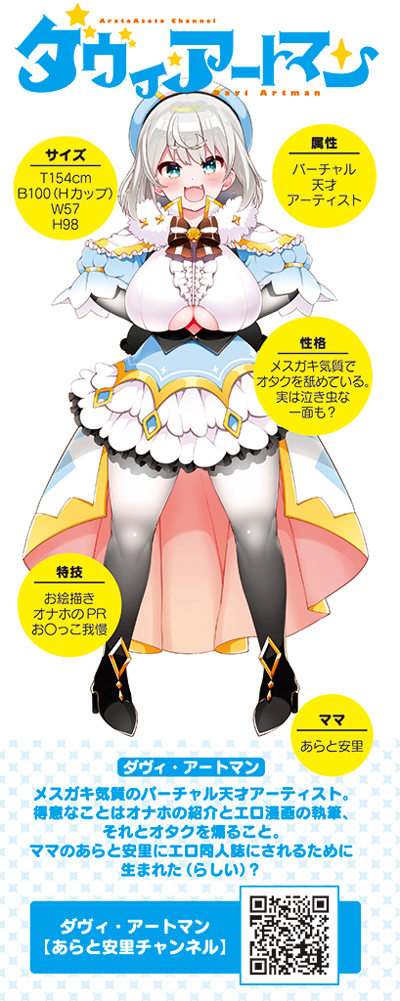 ダヴィ・アートマンとは、メスガキ気質のバーチャル天才アーティストで、得意なことはオナホの紹介とエロ漫画の執筆、それとオタクを煽ること。ママである「あらと安里」によってエロ同人誌のために生み出されたという美少女だ。